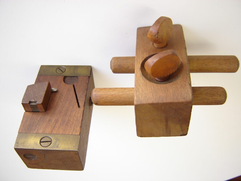 There are several wooden gadgety butt gauges that are as fun to operate as a Rubik’s Cube.  They have various adjustments for all measurements required in hinge layout.  On the right in Photo 2, the William McCullough gauge with it’s two thumbscrews, three scratch points and two arms, patented January 2, 1883 is that sort of tool.  Similarly, the Henry Plante gauge on the left, patented February 23, 1886, has that same feel.  Both gauges are for hinge layout only and are chunky in appearance.   The McCullough is the most difficult of the two to find.  I have only seen a few in sixteen years of collecting.