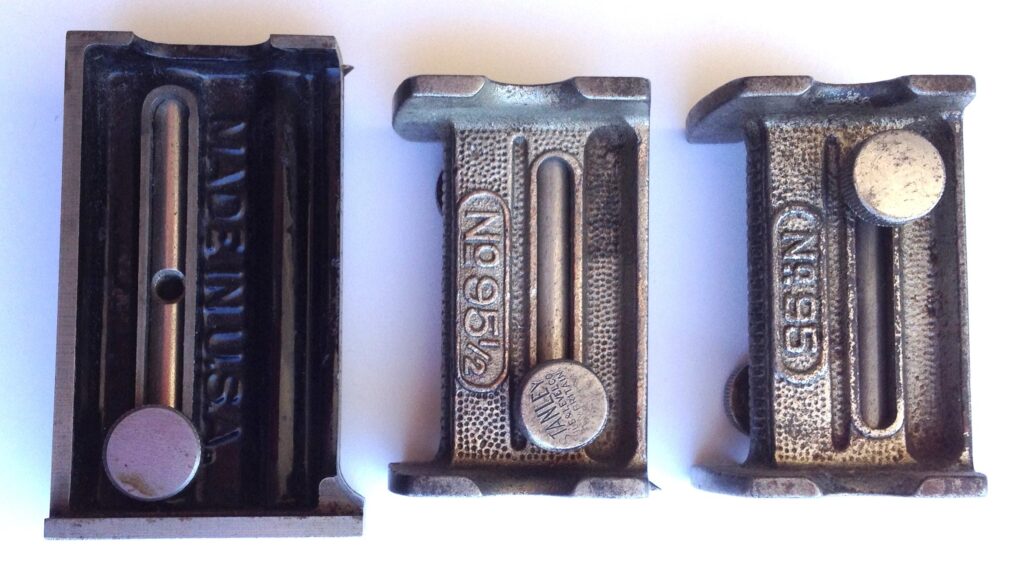 Stanley also made a series of nickle plated, all iron, butt gauges that were very efficient to use.  The No. 95 Butt Gauge on the right in Photo 5 was introduced in 1897 and sold for almost a century.  Stanley produced other variations of the No. 95; the nos. 95 ½, center & 94, left, which have slightly different dimensions but basically were the same style gauge.  The No. 94 shown here is japanned rather than nickle plated because of the need for nickle in the war effort of World War II.