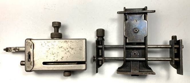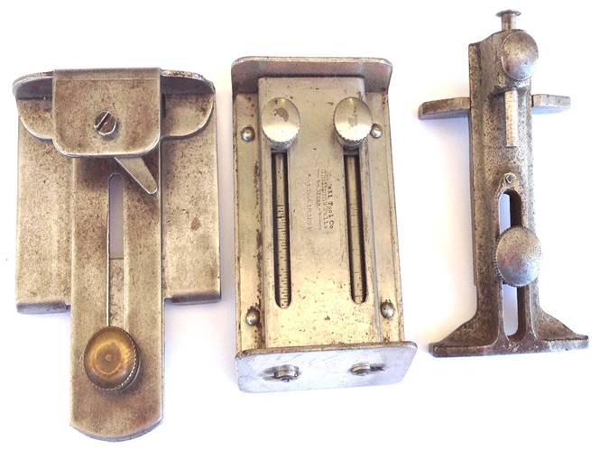One prickly little gauge absolutely bristling with 8 scratch points was patented by Matthew Biersdorf in Los Angeles on June 8, 1915.  It’s small enough to fit in your pocket but will surely put a hole in it.  It’s got all the bells and whistles of the larger gauges for a competent layout, see left in Photo 10.  An unusual gauge is the Wells & Meyer patent gauge that strikes the outline of the butt hinge in the wood.  It was patented April 3, 1923 and shown on the right in Photo 10.