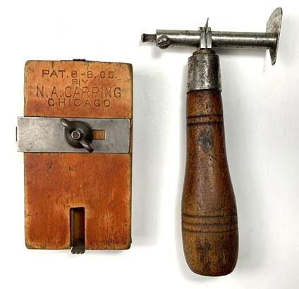 A very scarce N. A. Carping, Chicago, butt gauge has the double body wooden block construction very similar to the Fulton gauge.  Have you seen one before?  Patented August 8, 1905 it is on the left in Photo 11.  In the same photo on the right side is a very unusual butt gauge patented by James Duffy of Seattle, Washington on October 11, 1910.  It was produced by the Atkins Saw Co.  It’s a strange one to me!